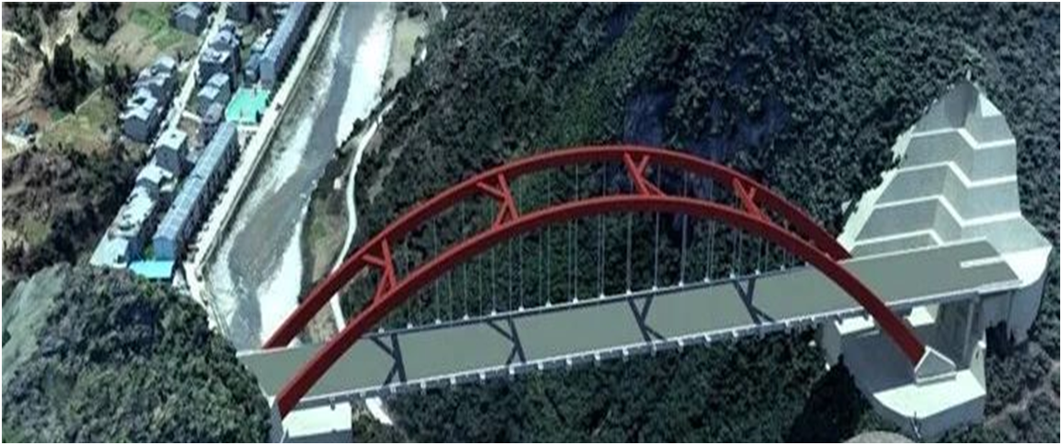 城開(kāi)蓼子特大橋位于重慶市城口縣蓼子鄉(xiāng),跨越前河,該工程的建成將成為城開(kāi)高速的標(biāo)志工程之一。該橋全長(zhǎng)330.812m,由主橋和兩岸引橋組成。主橋?yàn)橛?jì)算跨徑252m中承式鋼箱拱橋,拱肋中心間距28m,箱型拱肋寬2.4m,高3~5.5m。該工程施工現(xiàn)場(chǎng)沿線為典型的山嶺重丘區(qū),溝谷遍布、山勢(shì)陡峭,地質(zhì)地形極其復(fù)雜,運(yùn)輸、建設(shè)難度巨大、風(fēng)險(xiǎn)高。經(jīng)綜合考慮,將拱肋左右幅各分為26個(gè)節(jié)段,為保證運(yùn)輸安全及現(xiàn)場(chǎng)吊裝安全,再將GL1-GL4節(jié)段、GL23-GL26節(jié)段進(jìn)行橫向及縱向分段,共計(jì)76個(gè)運(yùn)輸分段。