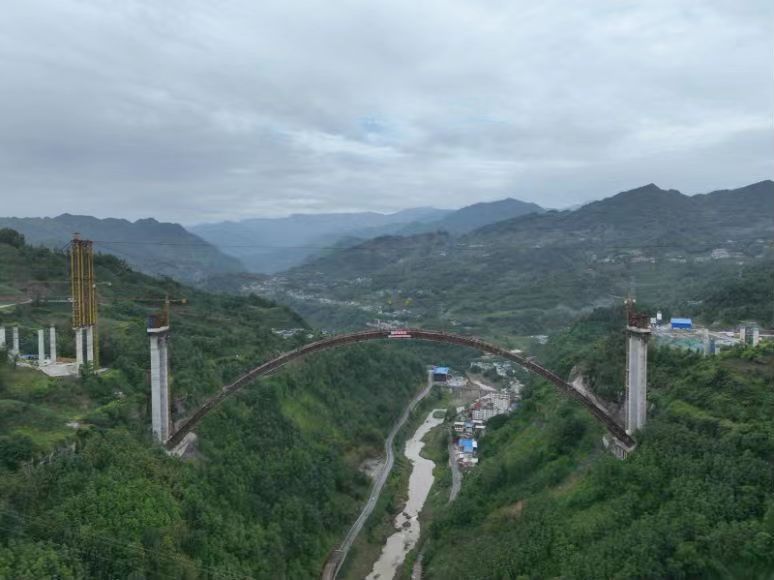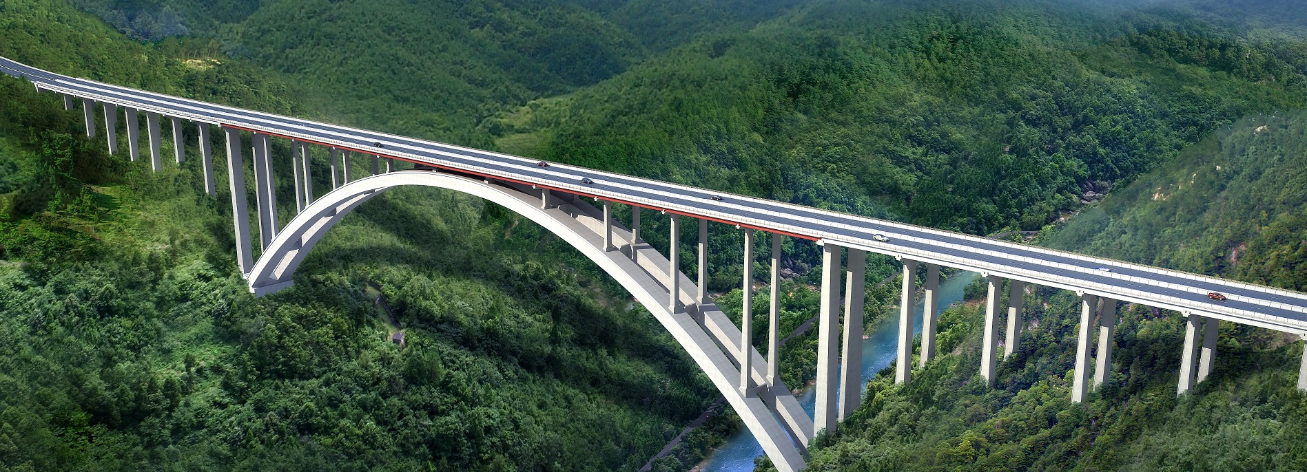 該橋主體結(jié)構(gòu)為主跨370.5米上承式鋼筋混凝土勁性骨架拱橋,主拱采用等截面(寬8m×高5.8m)懸鏈線無鉸拱,拱圈采用兩拱肋,兩拱肋間以橫聯(lián)連接。主拱圈采用連續(xù)熱彎成型工藝,現(xiàn)場(chǎng)采取先片拼后再進(jìn)行多節(jié)段長(zhǎng)線法立拼連續(xù)匹配制造工藝。