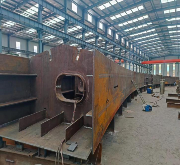 西寧祥瑞街大橋拱肋由兩片分離的拱肋及橫撐組成的組合式拱圈,拱肋采用五邊形鋼箱斷面,其拱軸線平面與豎直平面的夾角為3.0°,拱肋截面頂、底以及腹板板厚由拱頂處25mm變化至拱腳處40mm。廠內(nèi)下料及鉚裝工序精度要求高,焊接過(guò)程中金屬熔敷率大,對(duì)焊后變形及拱軸線精度控制有著更高的要求。在我司技術(shù)團(tuán)隊(duì)和質(zhì)量團(tuán)隊(duì)的共同努力下,有效控制了拱肋組裝精度。如今拱肋部分節(jié)段已鉚焊結(jié)束,成功下胎。
