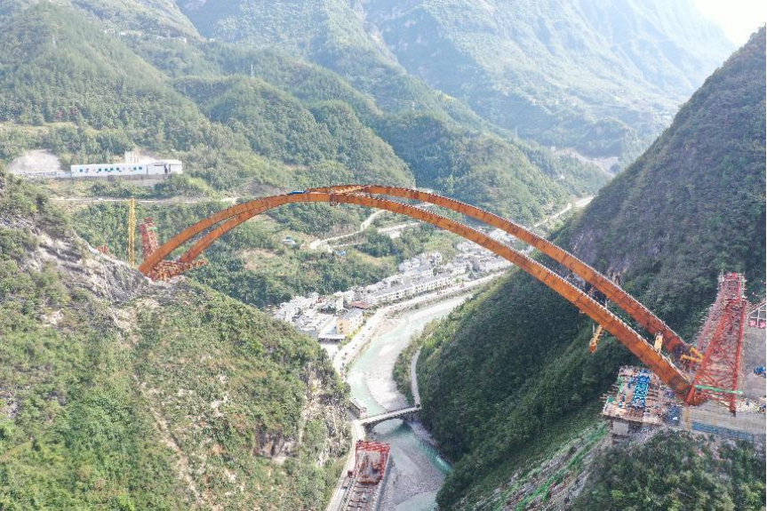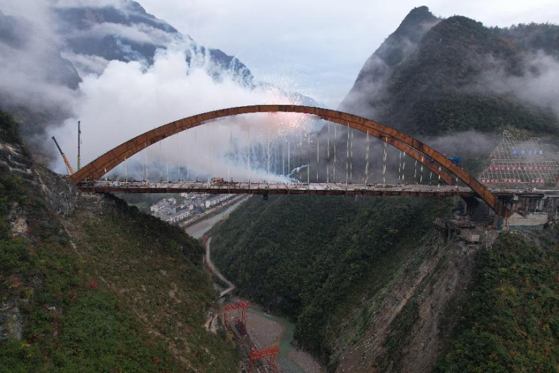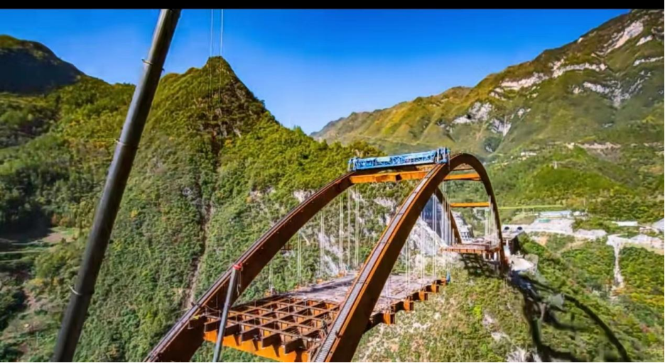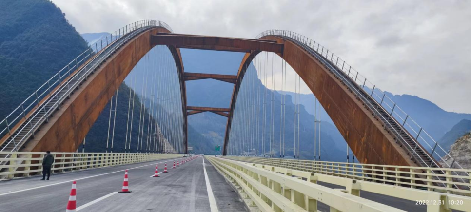 本次建成通車的城口雞鳴至縣城段,起于城口縣葛城街道金竹灣附近,設(shè)城口互通與城口縣城相通,經(jīng)城口縣城、蓼子鄉(xiāng)、雞鳴鄉(xiāng),與雪寶山北互通相接,路線全長約30公里,橋隧比高達(dá)98%,共設(shè)橋梁18座(其中特大橋4座)、隧道5座(其中特長隧道3座)、互通式立交2座、匝道收費(fèi)站2處。主要控制性工程有蓼子特大橋、雞鳴特長隧道。其中蓼子特大橋為中承式鋼箱拱橋,主跨252米,受復(fù)雜的地質(zhì)和極其狹窄的地形條件影響,該橋只能采用復(fù)合式轉(zhuǎn)體工藝,并采取拱上吊機(jī)進(jìn)行橋面系施工,技術(shù)復(fù)雜程度在國內(nèi)尚屬首次;雞鳴特長隧道長7.4公里,為高瓦斯隧道,施工中多次瓦斯溢出,安全風(fēng)險極高。在參建各方的刻苦攻關(guān)和共同努力下,城開高速順利建成通車至城口縣城,實(shí)現(xiàn)重慶“縣縣通高速目標(biāo)”。
